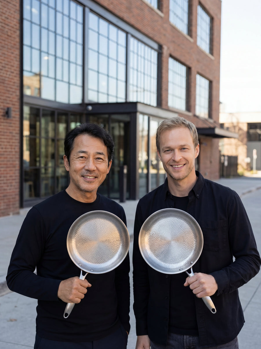 Tijdens zijn derde bezoek aan Japan ontmoette Sam Hiroshi Nakamura. Wat begon als gesprekken over vakmanschap en standaarden werd al snel een gedeelde visie โ kookgerei bouwen dat geworteld is in precisie en respect voor het materiaal.